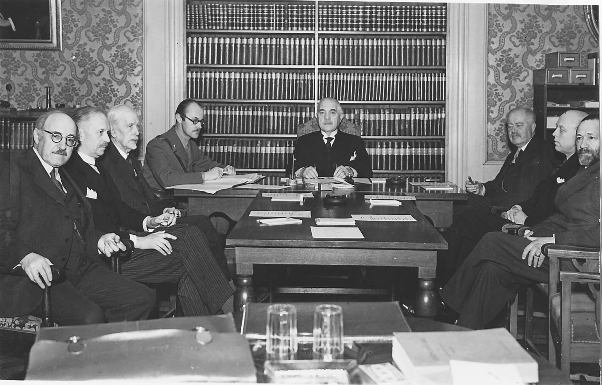Tekniska museets styrelse sammanträde den 5 december 1940 på Ingenjörsvetenskapsakademin. Fr. v. Intendent Torsten Athin, Ingenjör C.A. ult, Vattenrättsingenjör R. Smedberg, Professor C. Bennedichs, Kommerserådet A. Enström, Kommerserådet G. Dillner, Kamrer S.E. Österberg, Professor E. Hubendick.