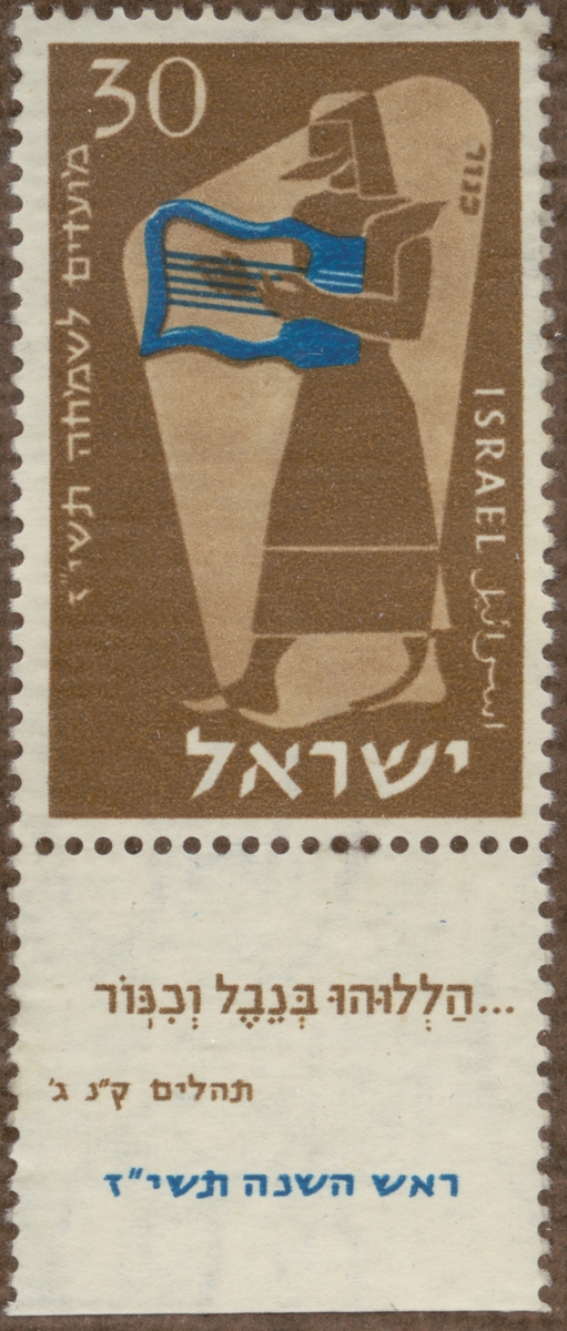 Frimärke från Israel, 1956. Motiv av musikinstrument. Lyra eller psaltare. "Psaltaren kap. 130:4: "Halleluja.- loven Gud i hans helgedom - loven honom med strängspel och pipa".