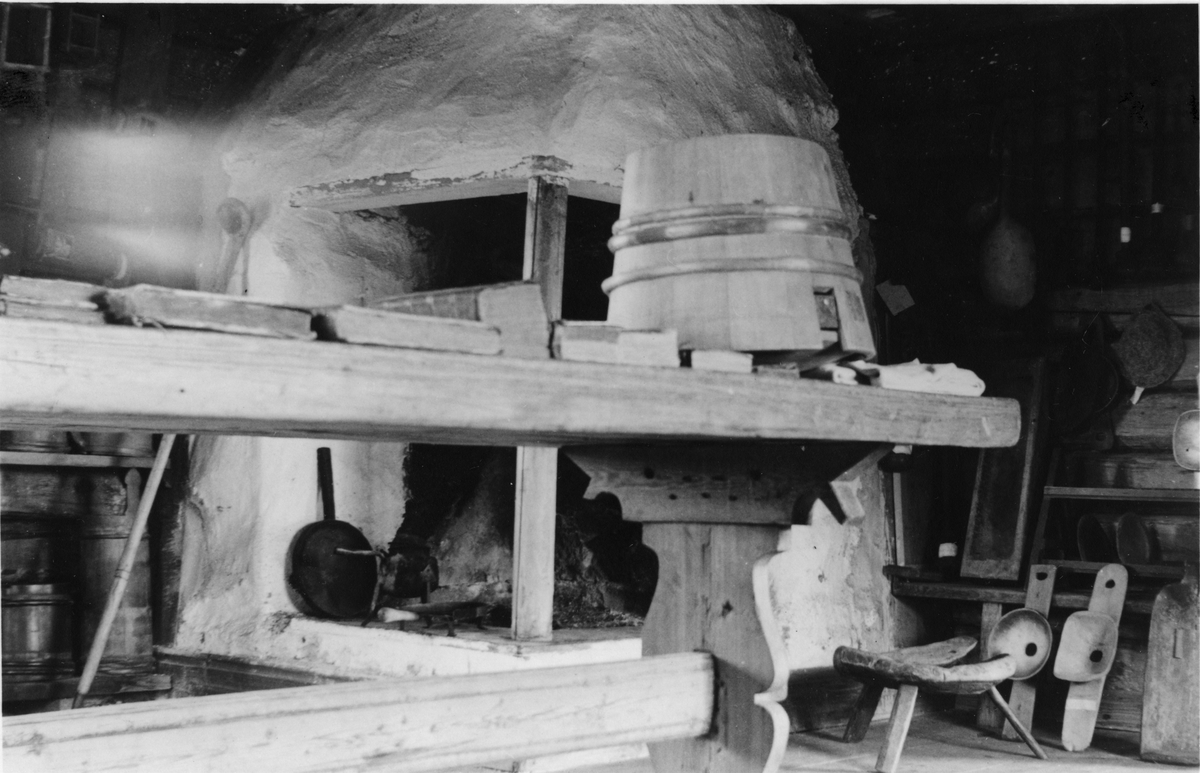 John Ericssons ritbord från hans lantmätartid samt, på bordet, hans "första försök till ångtryck". Interiör från "Logården", hembygdsgården vid Ovikens gamla kyrka, Jämtland. F.d. kyrkvärden Sivert Olsson Side ägde gården där ritbordet tidigare stått och där John Ericsson lär ha bott som lantmätare. "Fiskaregården".