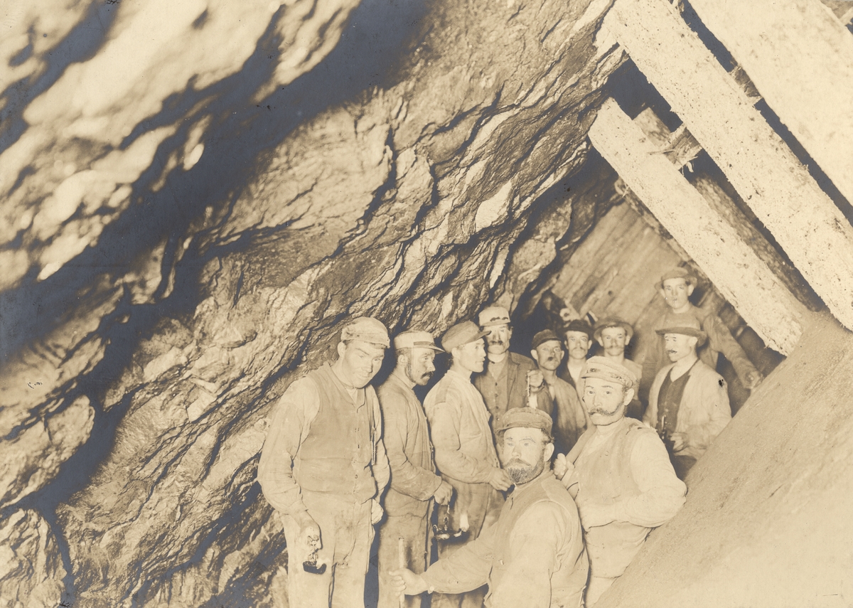 Blixtljus, interiör från Stora Mangens Koppargruvor, Värmland. Gruvarbetare vid gruvans botten.