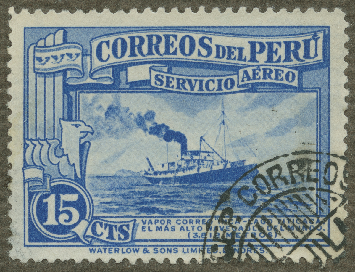 Frimärke från Peru, 1936. Motiv av Postångaren "Inca" på sjön Titicaca.--
