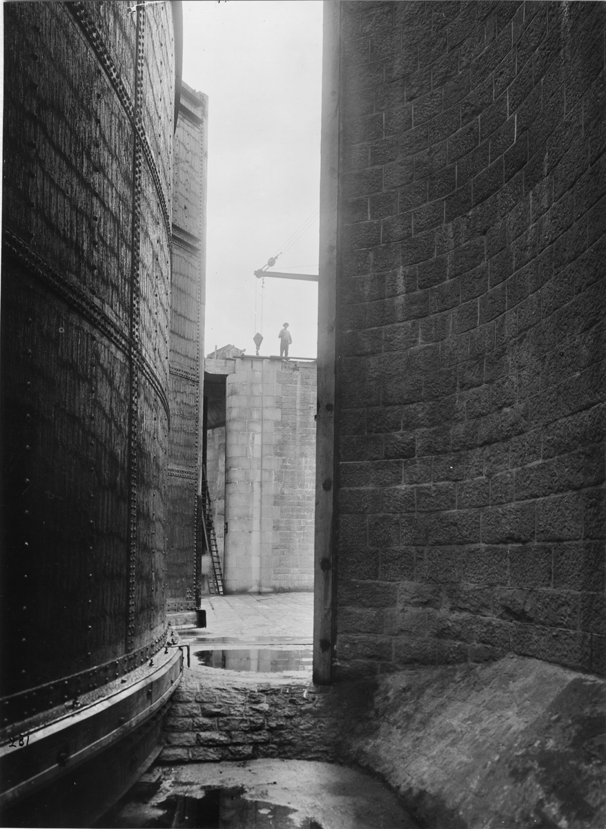 Södertälje Kanal. Ombyggnaden. Vy av öppning mellan murverk och slussport med tätningslist.