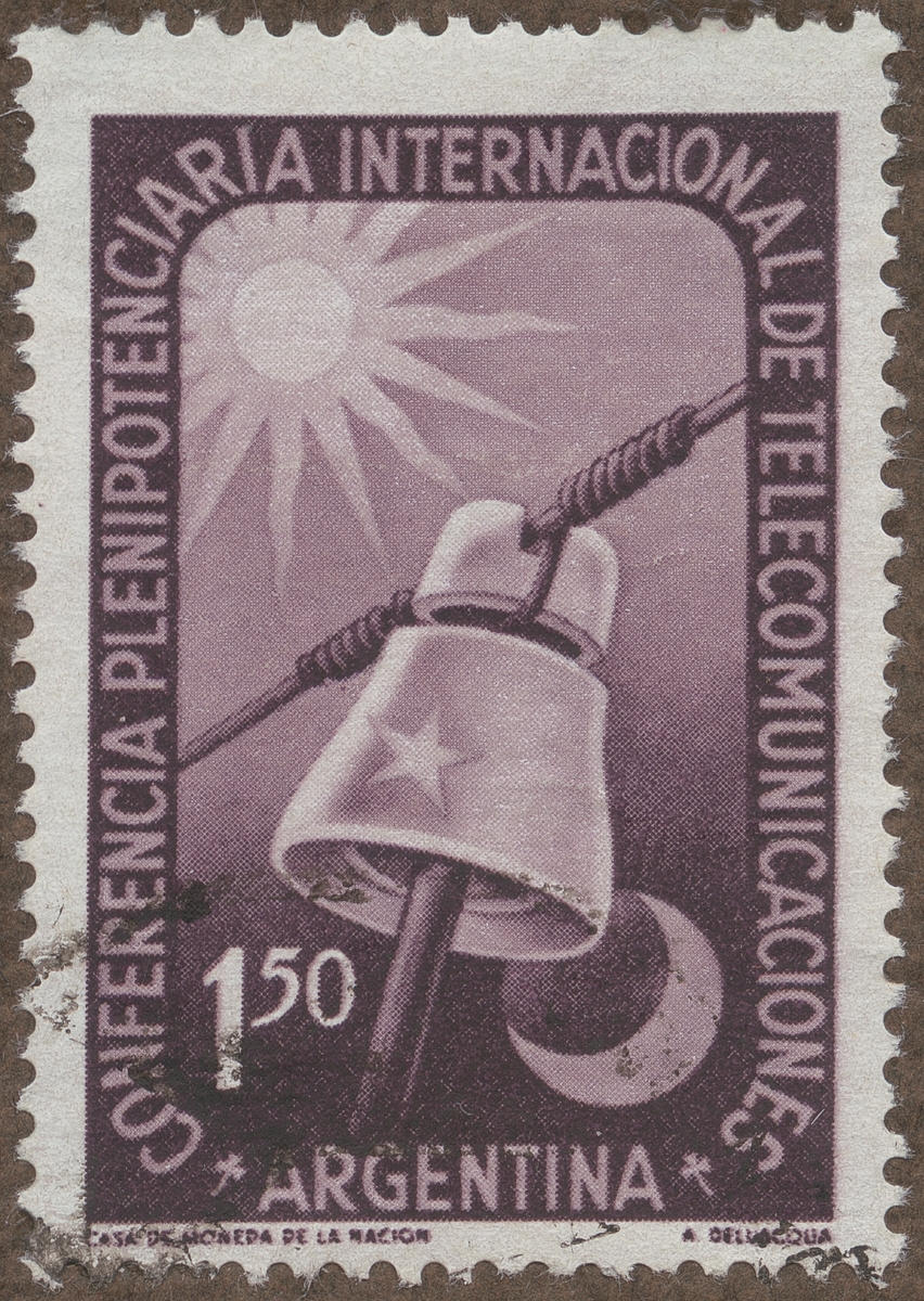 Frimärke ur Gösta Bodmans filatelistiska motivsamling, påbörjad 1950. Frimärke från Argentina, 1954. Motiv av Kraftledningssymbol "-Minne om International Konferens om telekommunikation i Buenos Aires 1952-"
