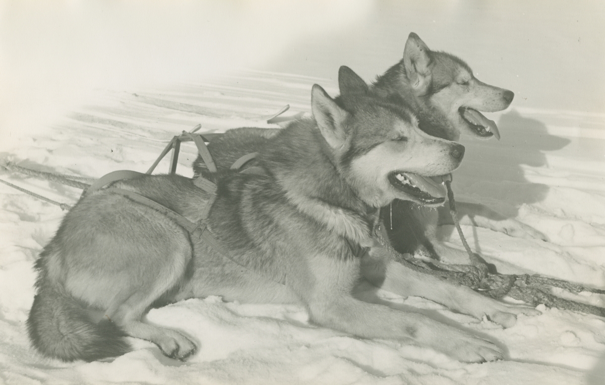 Fotografi från låda märkt Bernt Balchen. Balchen var norsk-amerikansk flygare, polarforskare och militär. Motiv av två polarhundar som vilar i snön.
