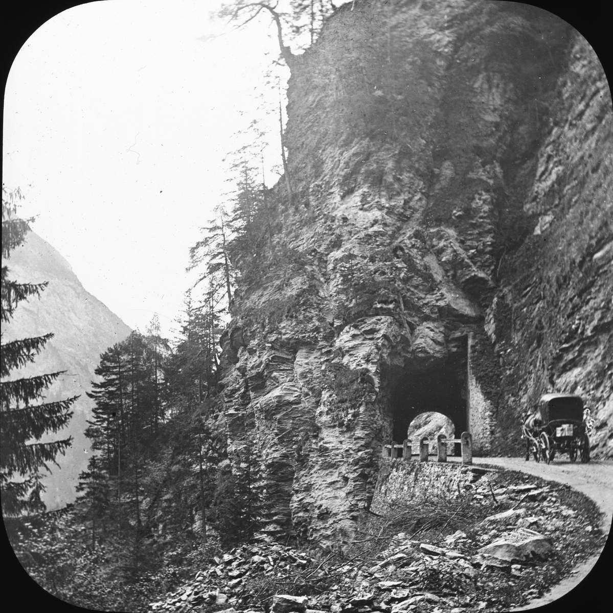 Skioptikonbild. Häst och vagn på landsväg i okänt bergsområde.