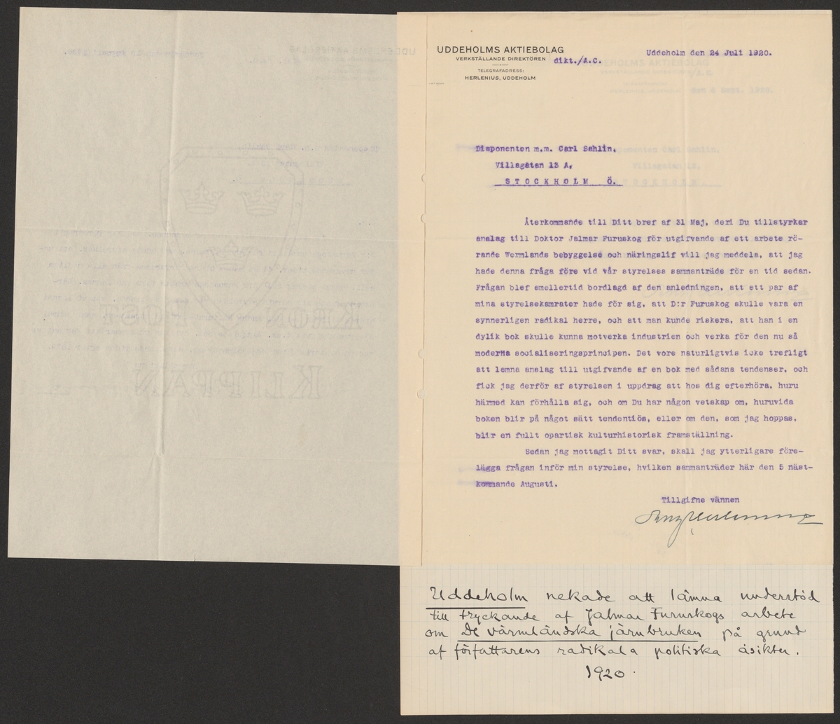 Titel: Uddeholmsverkens kronologi. Uddeholms AB. Ur Carl Sahlins bergshistoriska samling.