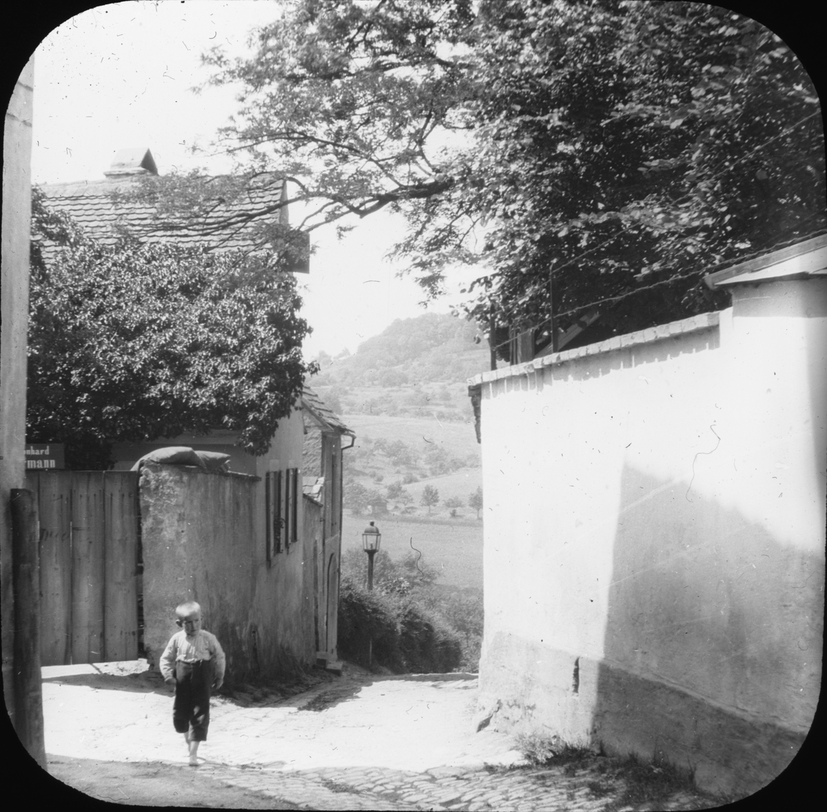 Skioptikonbild med motiv av liten pojke på gata i Bamberg.