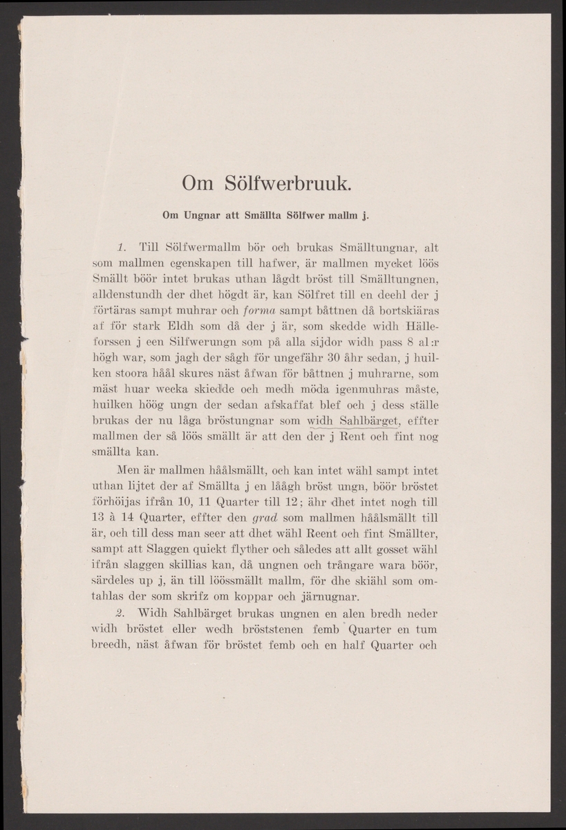 Titel: Sala gruva och silververks kronologi. Sala Silvergruva. Ur Carl Sahlins bergshistoriska samling.