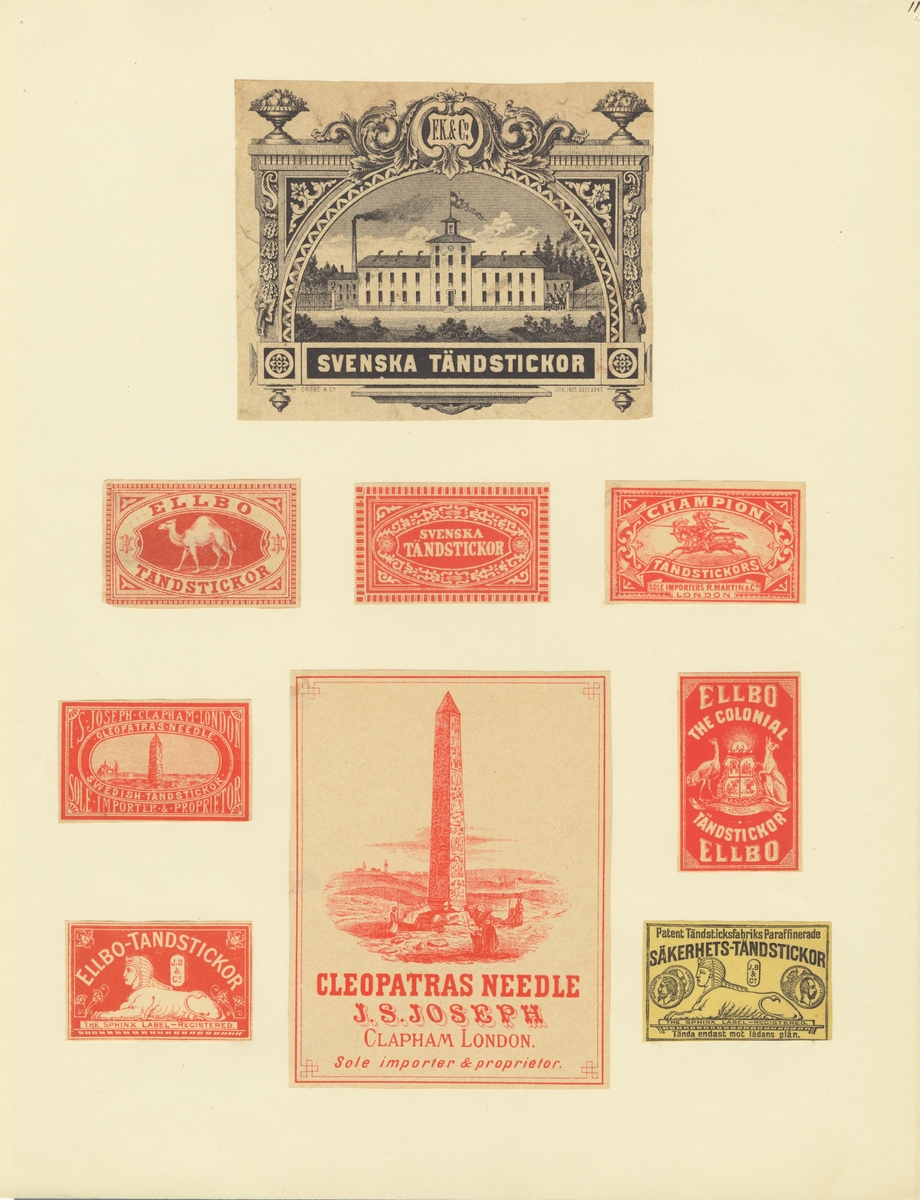 (Svenska Tändstickor, Ellbo Tändstickor, Cleopatras Needle, J. S Joseph).