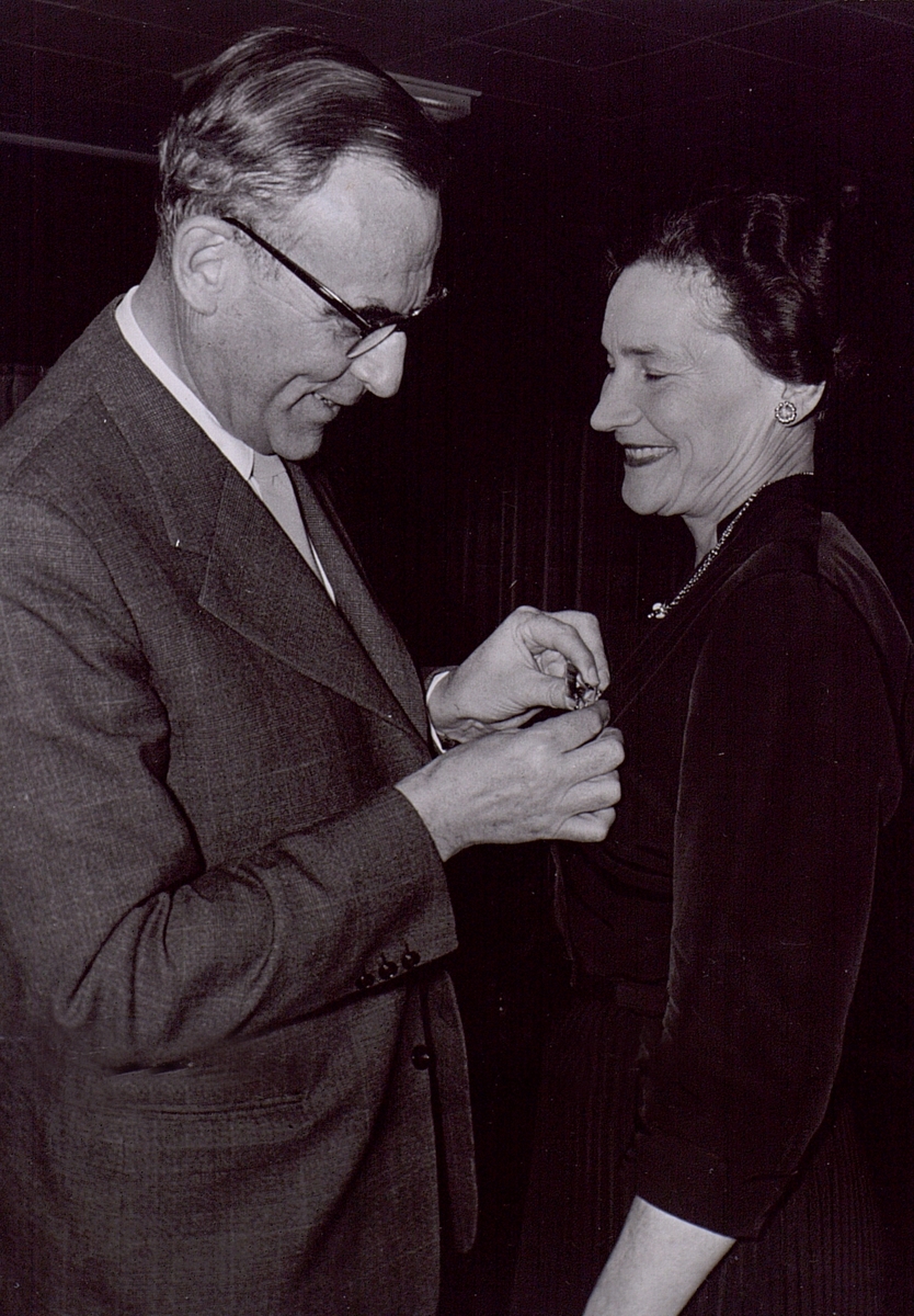 Fru Montgomerie-Jensen mottager sin medalj av generaldirektör Sterky d. 18.11.1955.