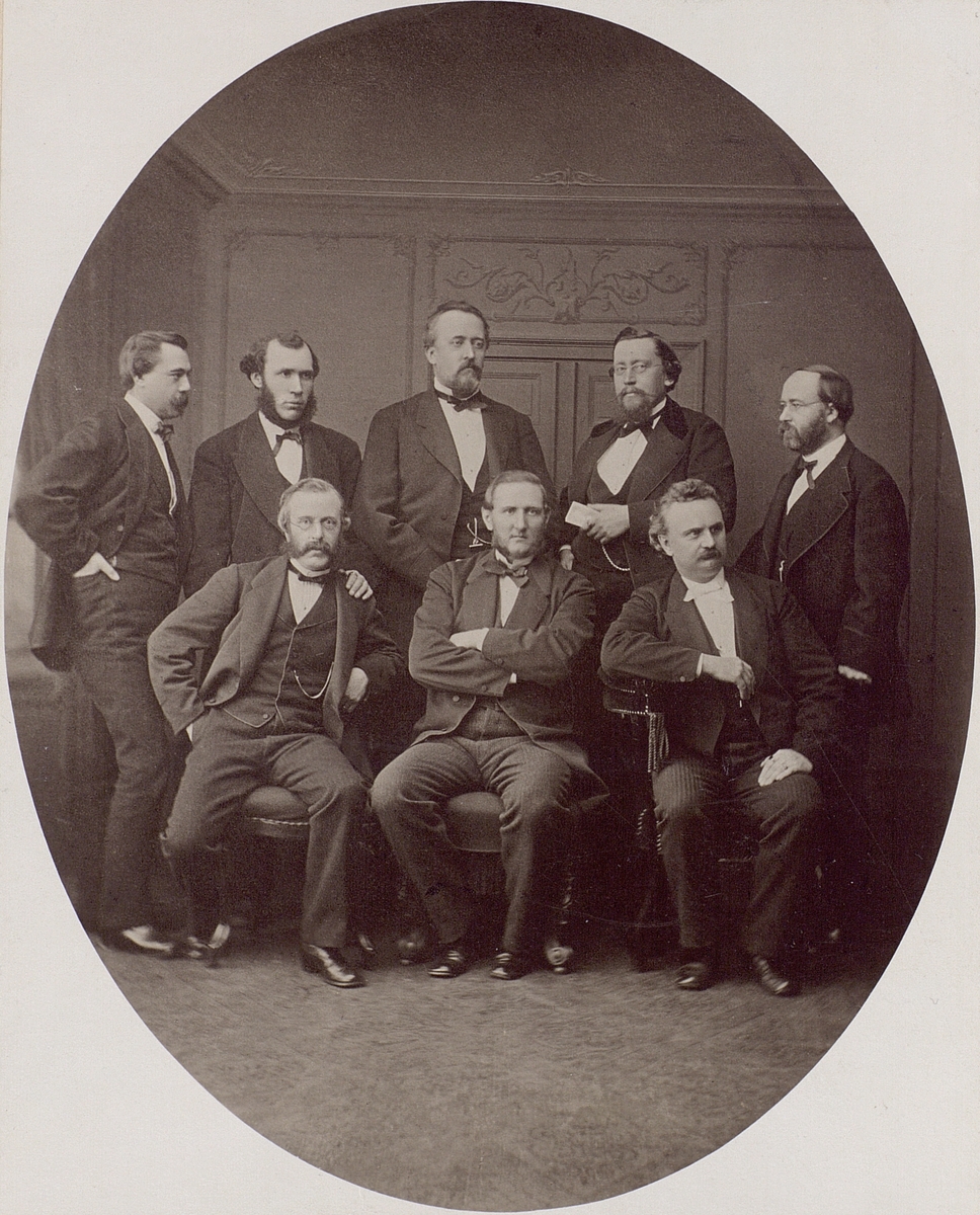 Telegrafverkets Pensionskommitté år 1874. Övre raden: T Lidman, M wennman, G Lybeck, E Hedlund, A Gummelius. Nedre raden: L v. Platen, D Kiellander, G Näsman.