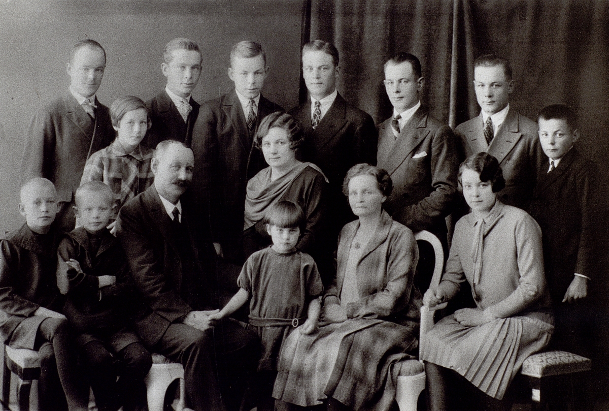 Här är en familjebild från 1920-talet på den telefamiljen Gunnar Eriksson i Hudiksvall. Av de 15 personerna på bilden har 7 varit anställda vid Televerket.