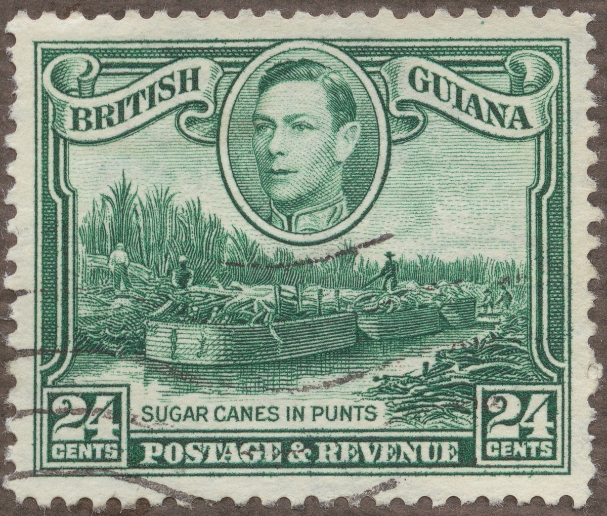 Frimärke från Brittiska Guyana, 1938. Motiv av sockerrörstransport i pråm. Kung George VI.