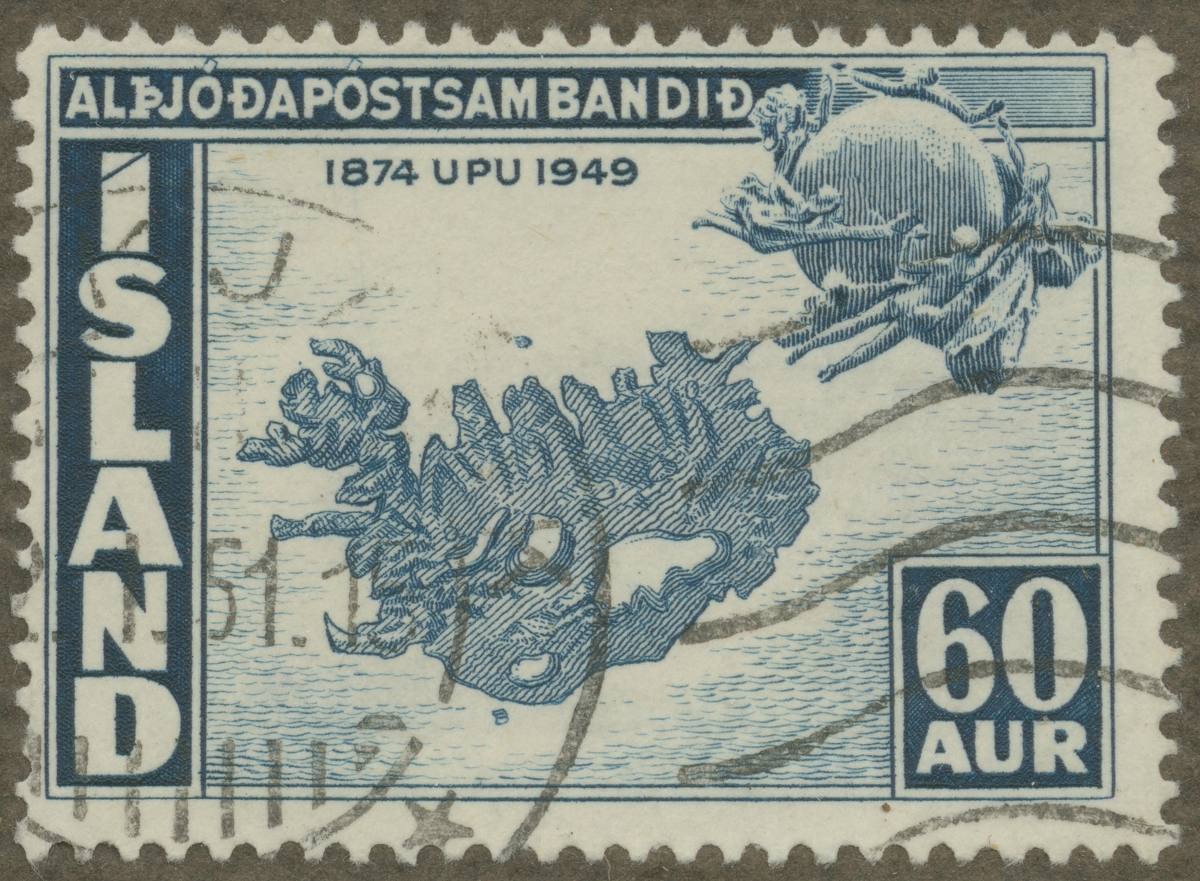 Frimärke från Island, 1949. Motiv av karta över Island. "Världspostföreningen 75 år 1874-1949".