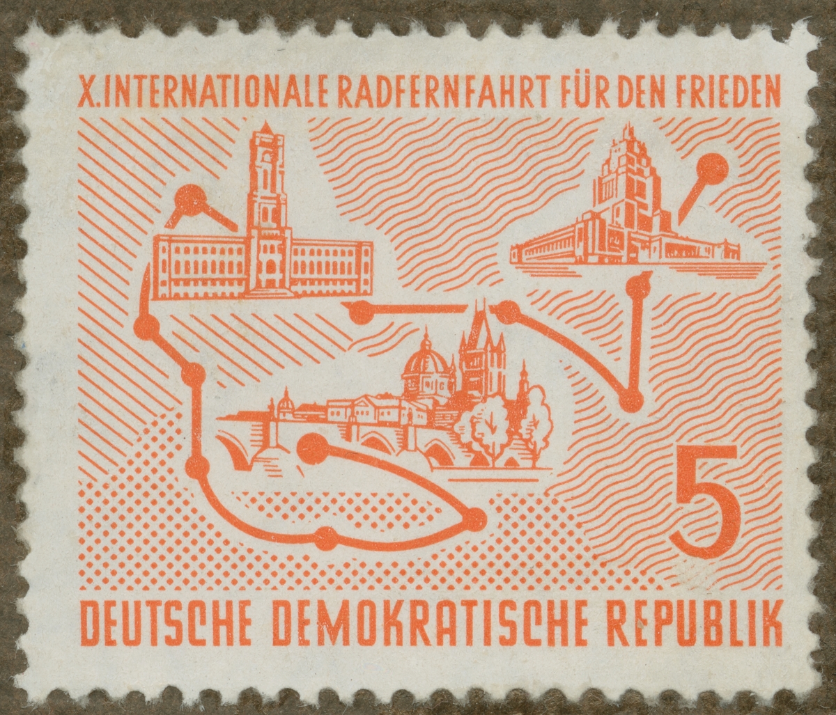 Frimärke från Östtyskland, 1957. Motiv av karta över X-nde cykelloppet "Für de Frieden".