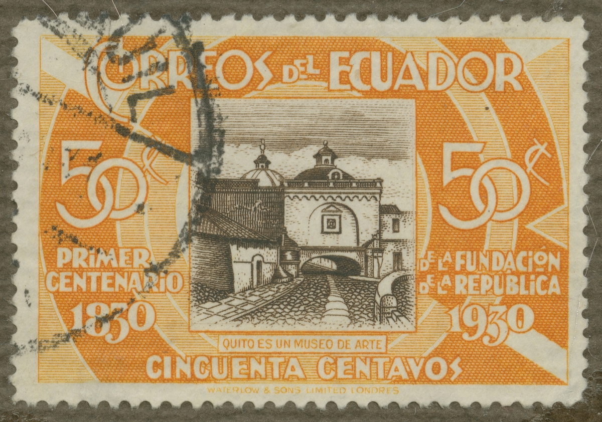 Frimärke från Ecuador, 1930. Motiv av "Quito: Ett konstmuseum". "100-årsminne av republikens grundande 1830-1930".