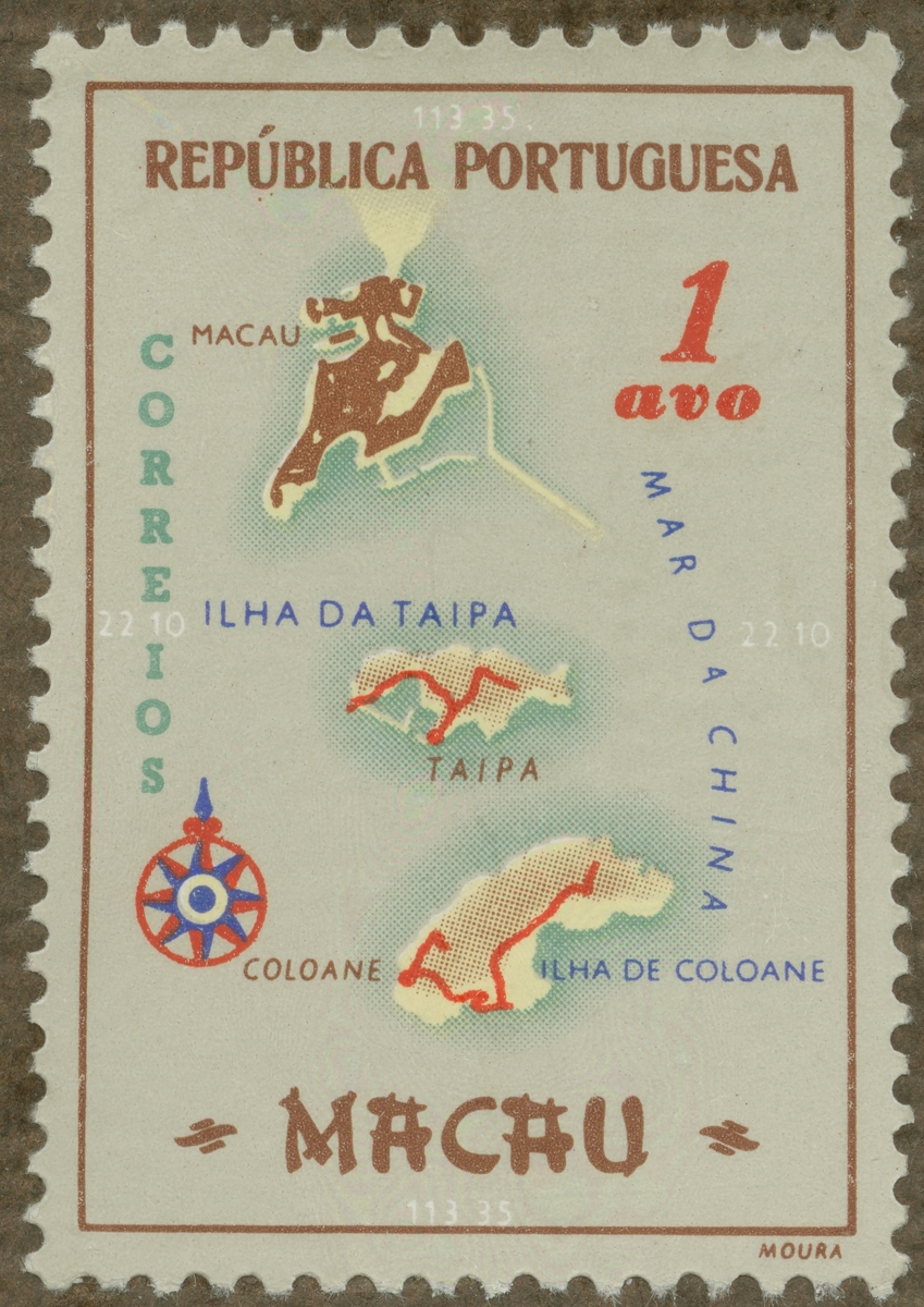 Frimärke från Macau, 1956. Motiv av karta över tre öar. Macaugruppen: Macau, Taipa och Coloane.