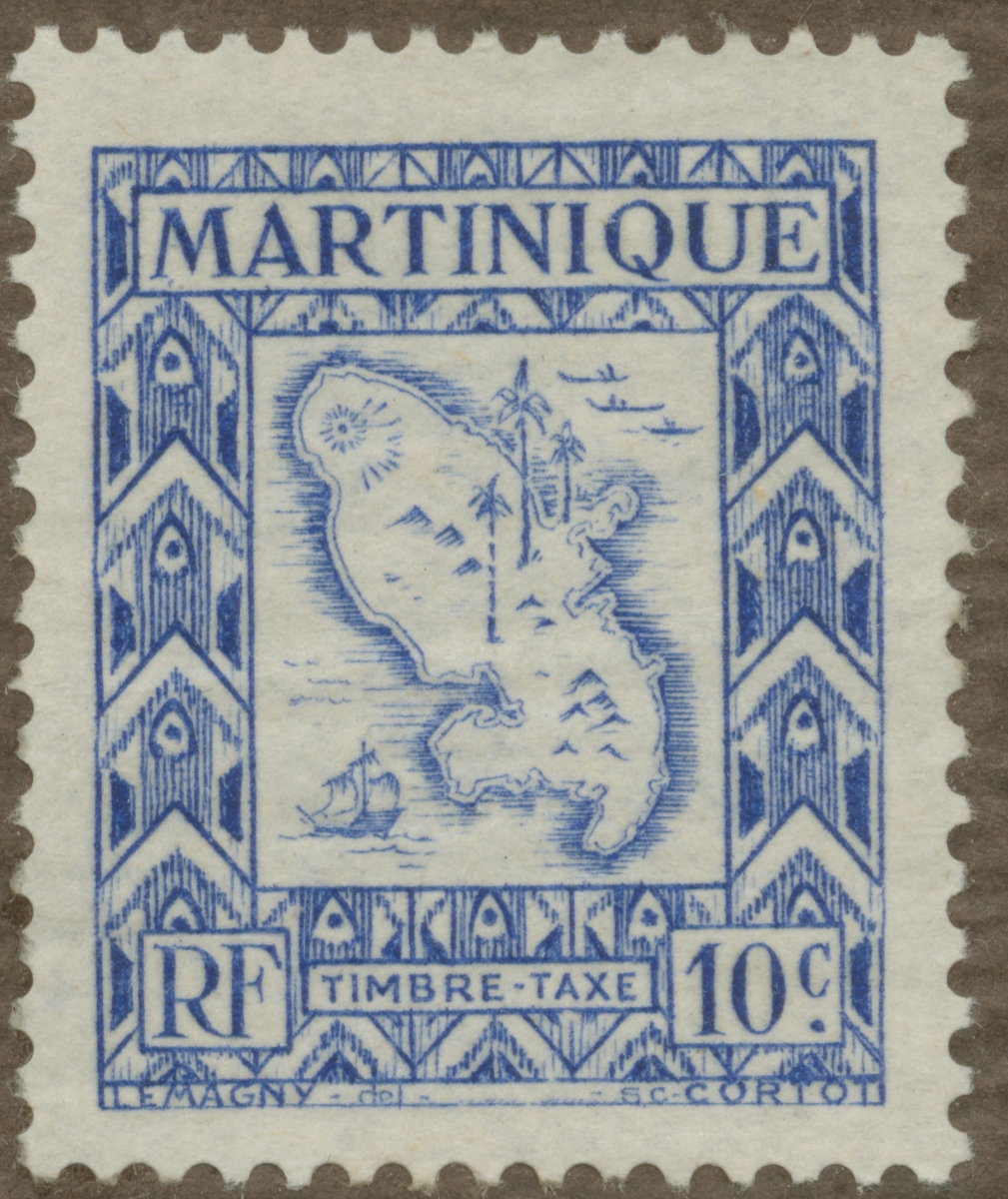 Frimärke från Martinique, 1943. Motiv av karta över Martinique.