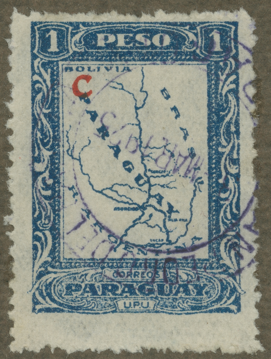 Frimärke från Paraguay, 1924. Motiv av karta med Paraguay, Bolivia och Brasilien.
