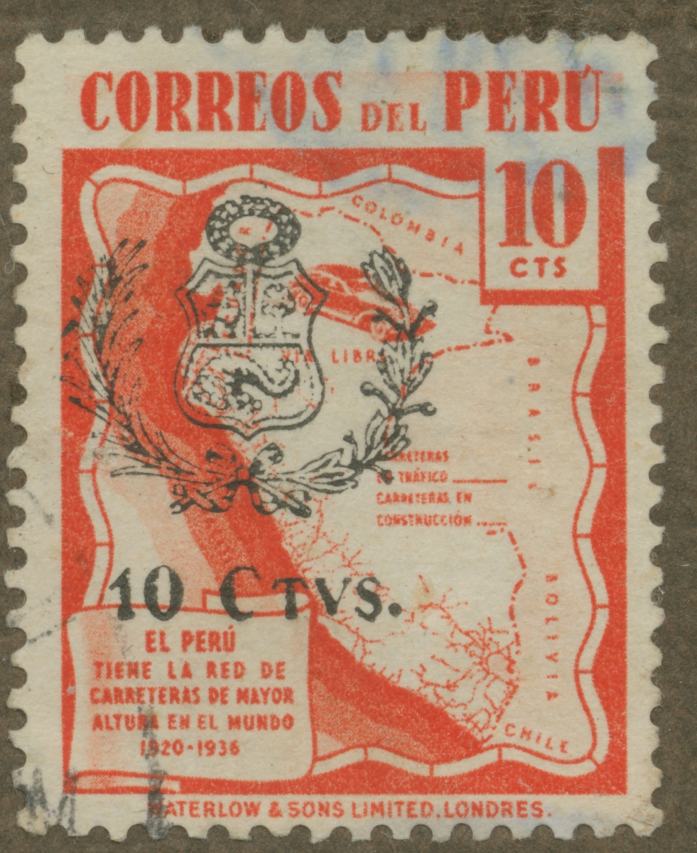 Frimärke från Peru, 1938. Motiv av karta över Peru, visande Perus motorvägnät.