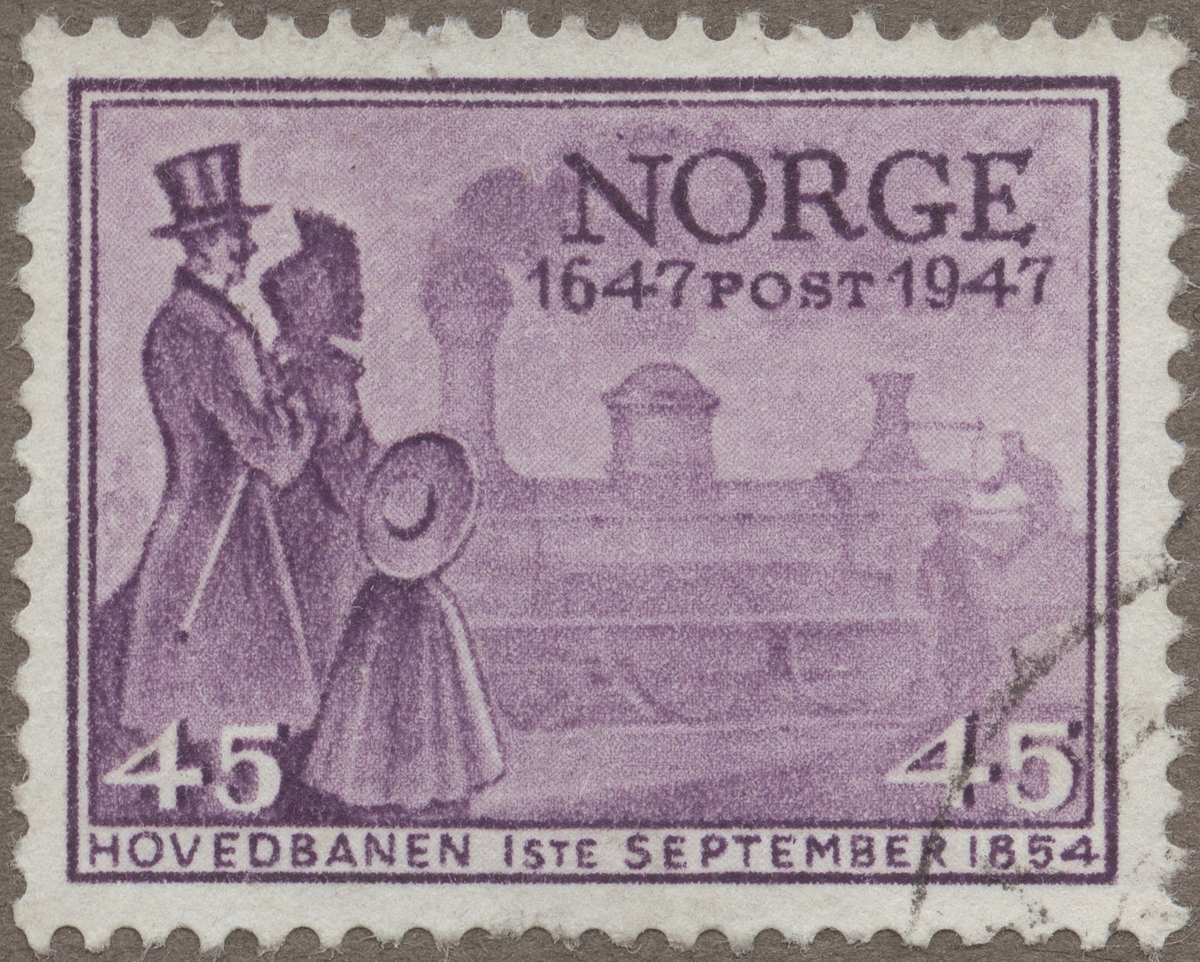 Frimärken ur Gösta Bodmans filatelistiska motivsamling, påbörjad 1950. Frimärke från Norge, 1947. Motiv av Lokomotiv på Hovedbanan i Norge den 1 sept. 1854. "300-årsminne av det norska postväsendet: 1647-1947."