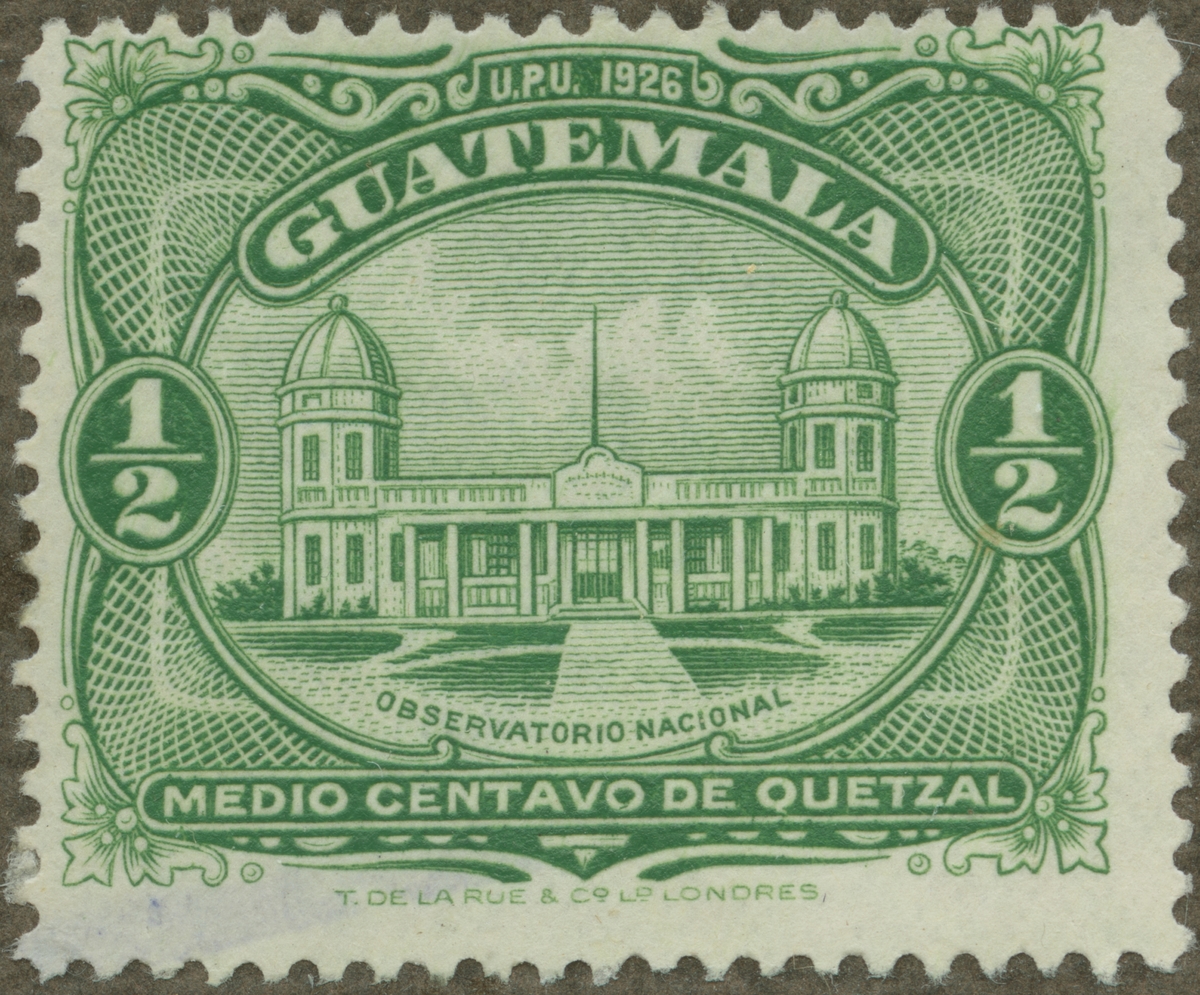 Frimärke ur Gösta Bodmans filatelistiska motivsamling, påbörjad 1950. Frimärke från Guatemala, 1926. Motiv av Astronomiska Observatoriet i Guatemala
