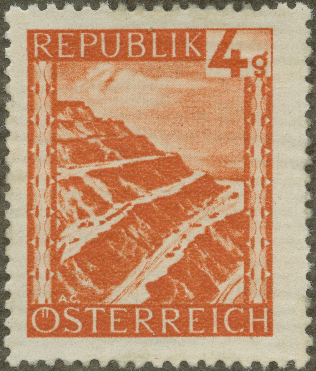Frimärke ur Gösta Bodmans filatelistiska motivsamling, påbörjad 1950. Frimärke från Österrike, 1945. Motiv av Malmberg i Österrike: "Erzberggruvorna i Eisenerzalperna"