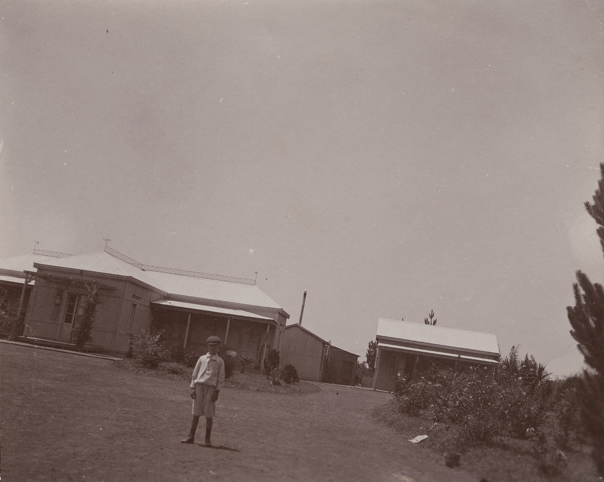 Fotografi från första svenska Antarktisexpeditionen 1901-1904. Motiv av pojke framför hus.