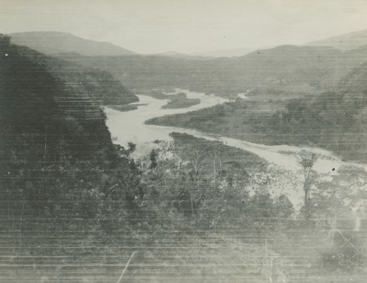 Fotografi från expedition till Peru 1920. Vy över en flod som rinner genom ett bergslandskap.
