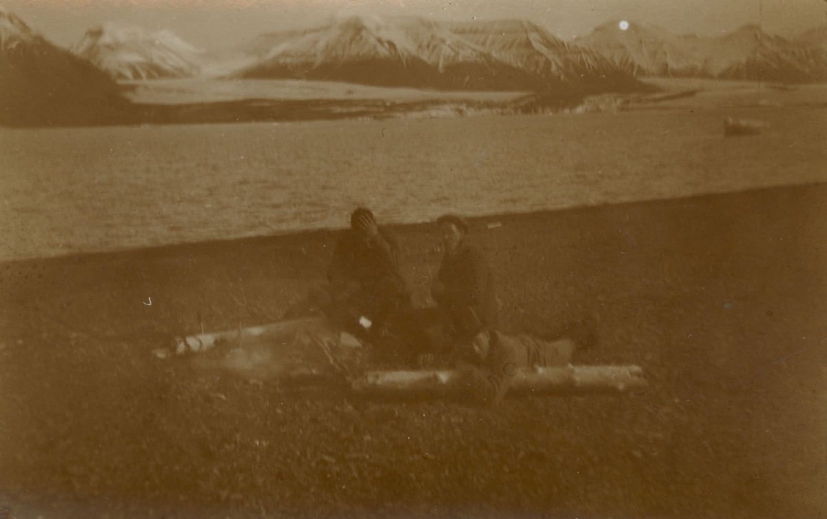 Fotografi från expedition till Spetsbergen. Motiv av tre män som vilar sig på en stenig strand vid vatten. I bakgrunden syns snötäckta berg.