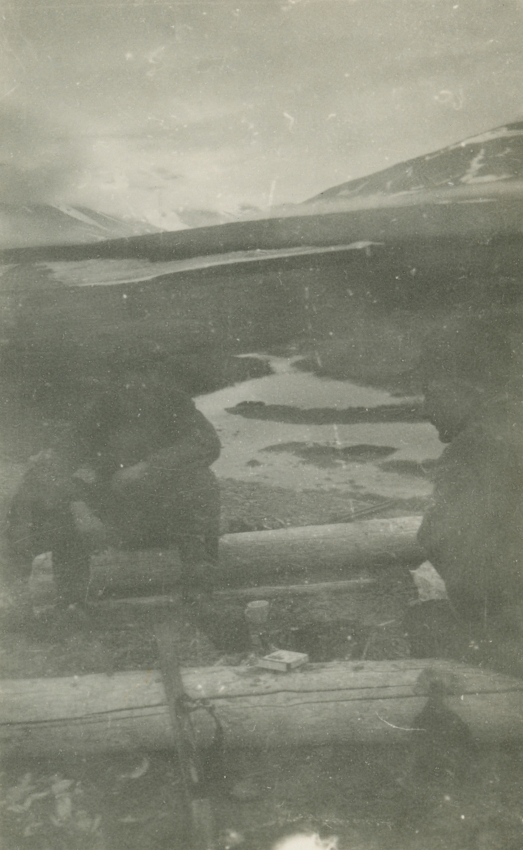 Fotografi från expedition till Spetsbergen. Motiv av två män som sitter och vilar på trästockar i bergslandskap.