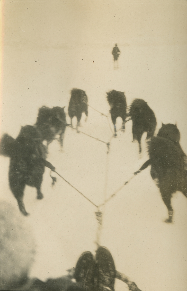 Fotografi från expedition till Spetsbergen. Motiv av hundspann som drar expeditionsdeltagare i snön.