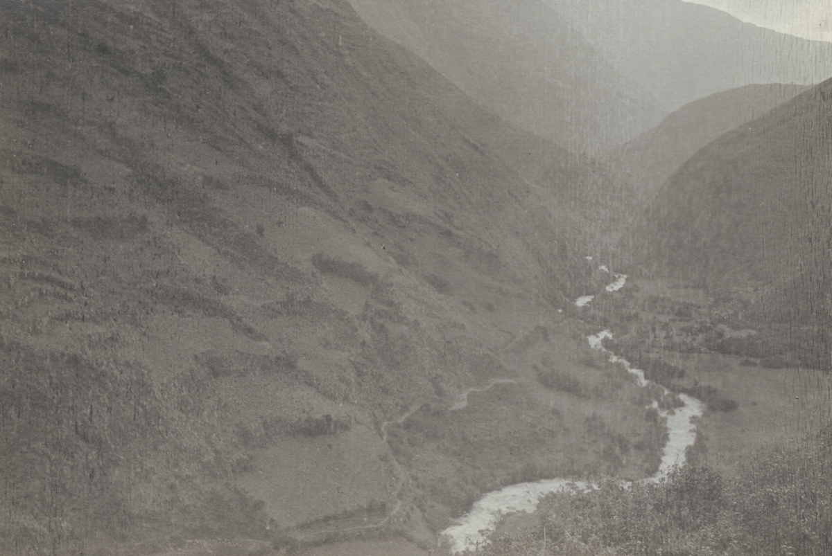 Fotografi från kuvert märkt med "Ernst Nordenskjöld". Vy över flod som rinner genom ett bergslandskap.