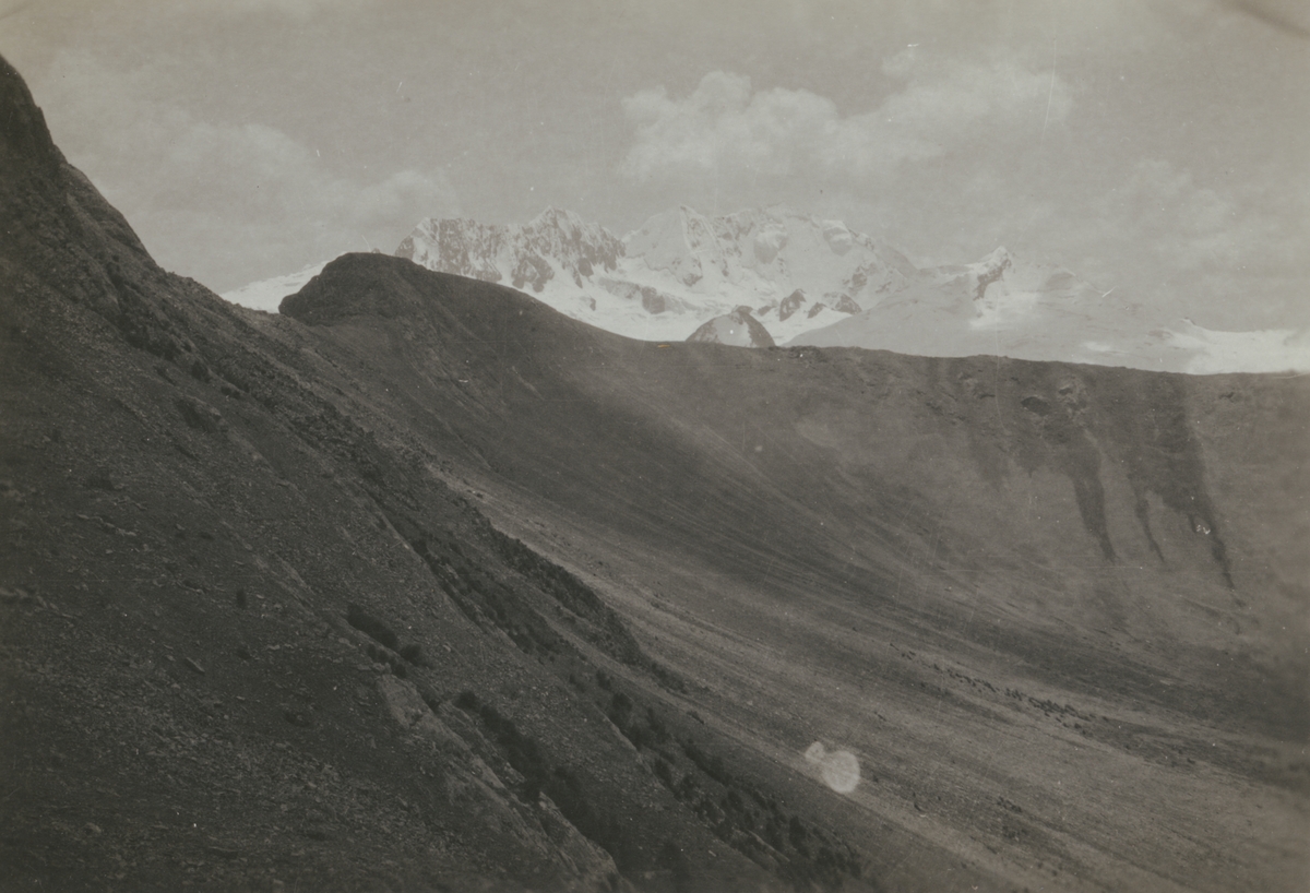 Fotografi från kuvert märkt med "Ernst Nordenskjöld". Vy över ett kargt och vidsträckt bergslandskap. Några av bergen är täckta av snö.