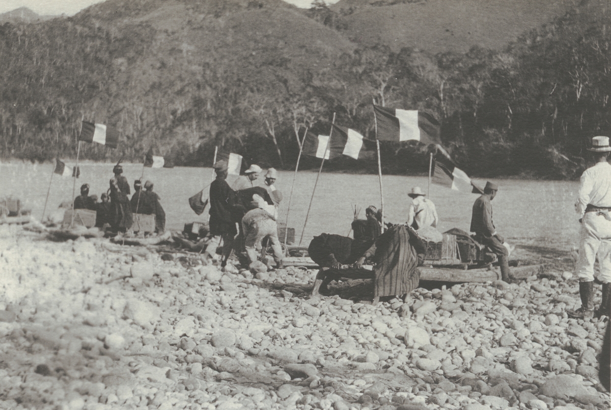 Fotografi från kuvert märkt med "Ernst Nordenskjöld". Motiv av expeditionsdeltagare med flottar vid flod i djungeln.