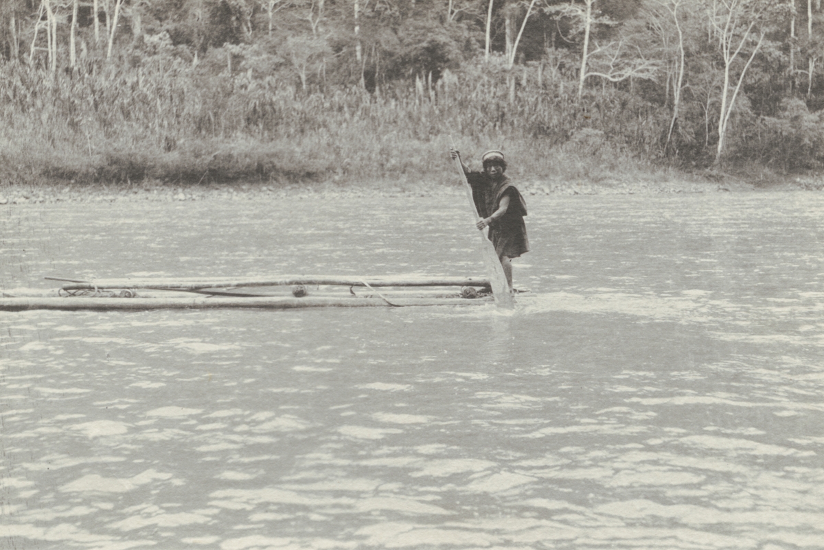 Titel: Fotografi från kuvert märkt med "Ernst Nordenskjöld". Motiv av man på flotte i flod i djungel.
