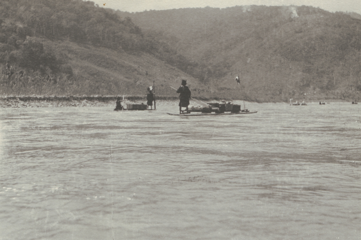 Fotografi från kuvert märkt med "Ernst Nordenskjöld". Motiv av personer på flottar i flod i djungel.