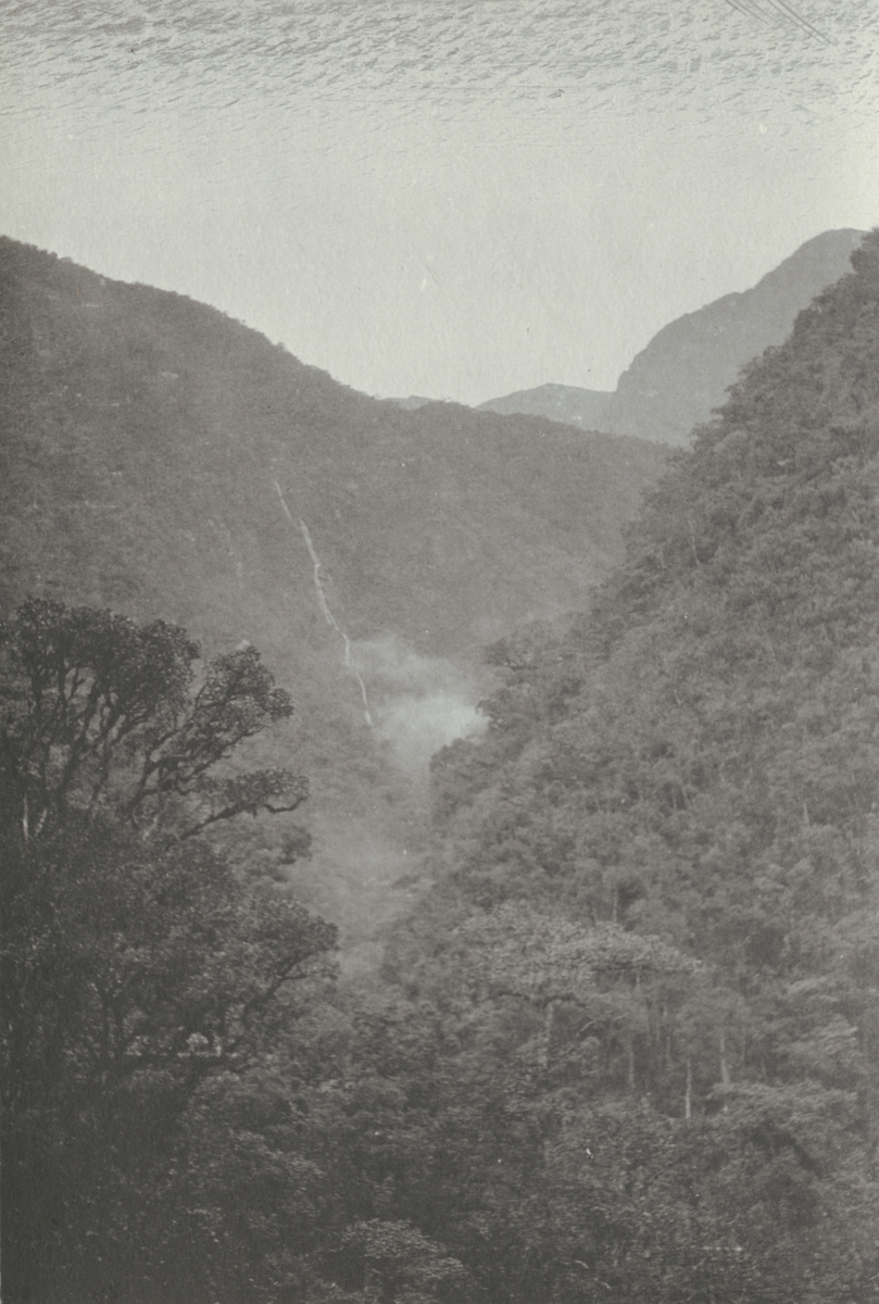Fotografi från kuvert märkt med "Ernst Nordenskjöld". Vy över bergigt djungellandskap.