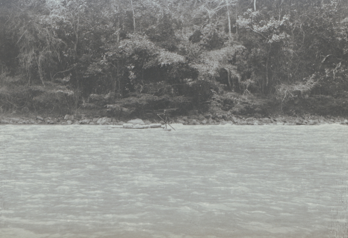Fotografi från kuvert märkt med "Ernst Nordenskjöld". Motiv av man på flotte i flod i djungeln.