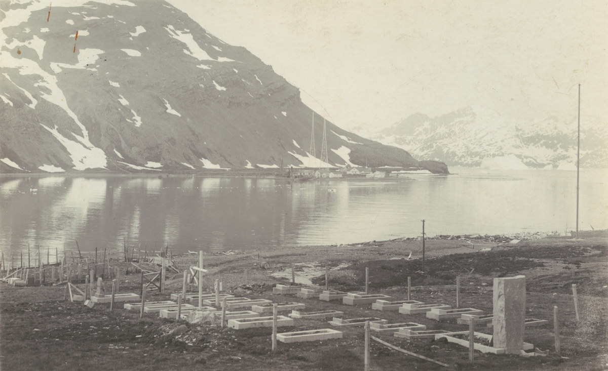 Bild från expedition i Antarktisområdet. Vy över kyrkogård, hav och berg. I förgrunden syns Shackletons gravmonument, 1928.
