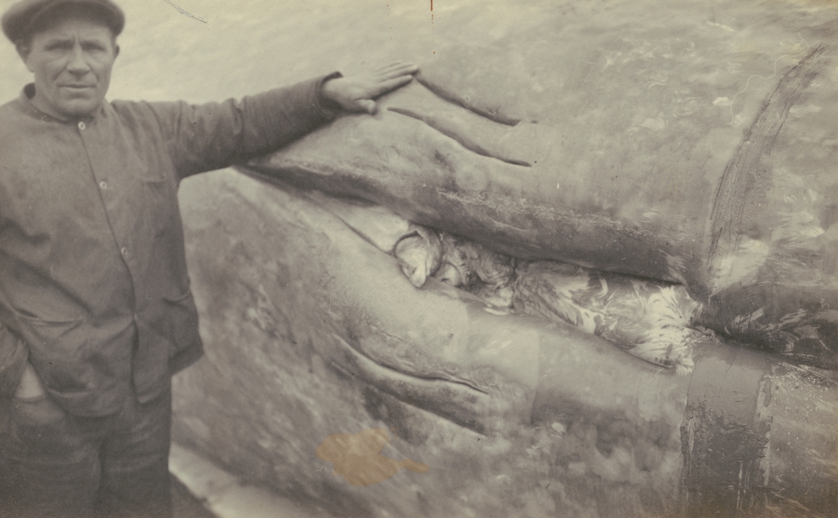 Bild från expedition i Antarktisområdet. Motiv av man bredvid död val, 1929.