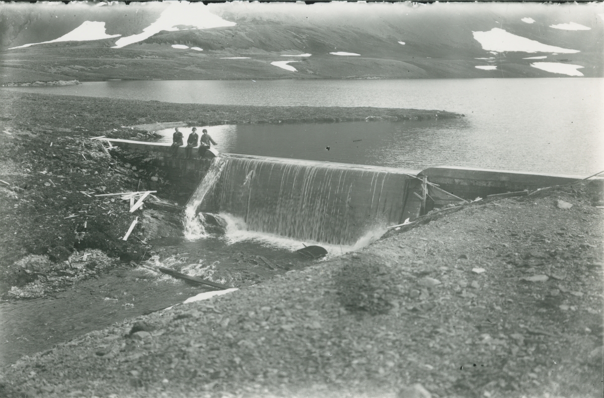 Bild från expedition i Antarktisområdet. Motiv av tre män som sitter vid sluss, Sydgeorgien.
