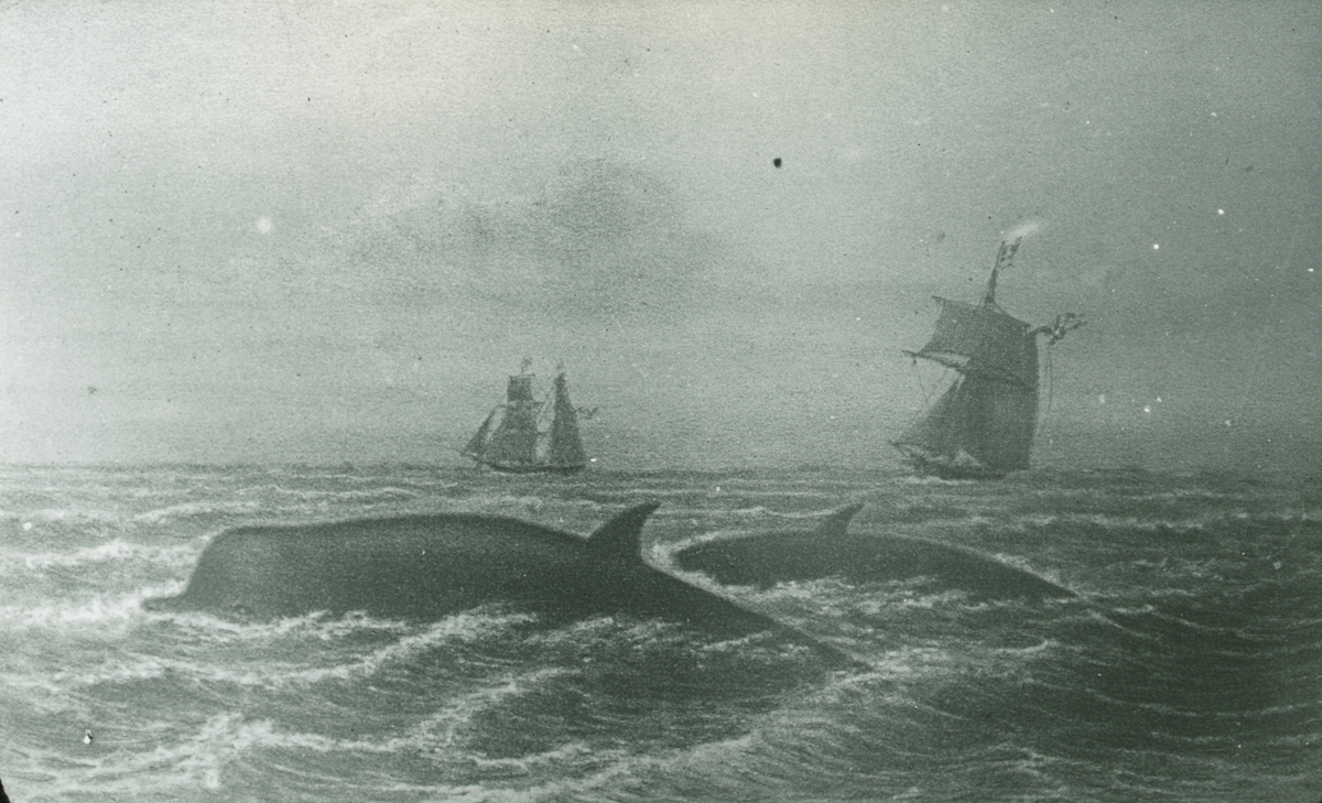 Fotografi från Grönland. Målning av valar och fartyg i havet.