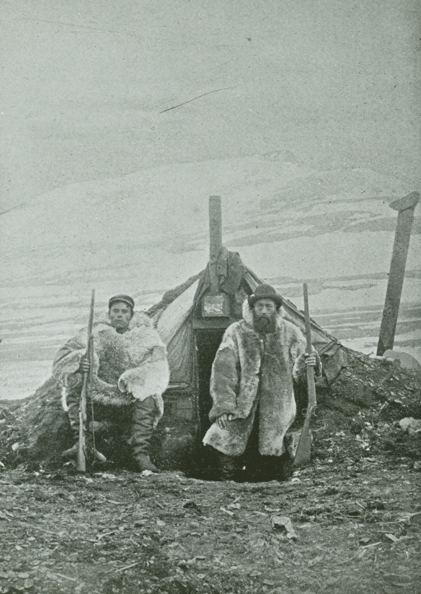 Fotografi från expedition till Spetsbergen. Motiv av två män med gevär framför hydda.