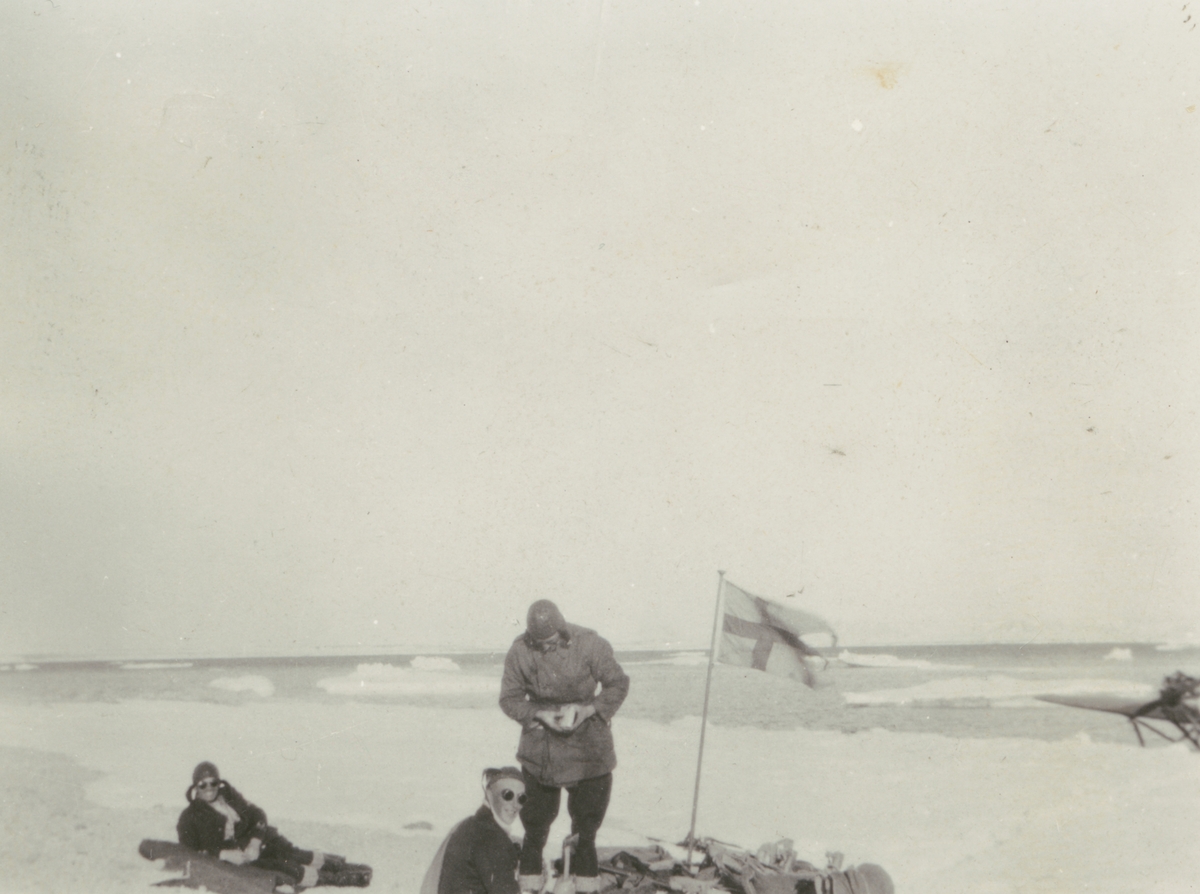 Fotografi från svenska undsättningsexpeditionen 1928. Motiv av tre män i snölandskap. Från vänster: Jacobsson, Rosensvärd, Christell.