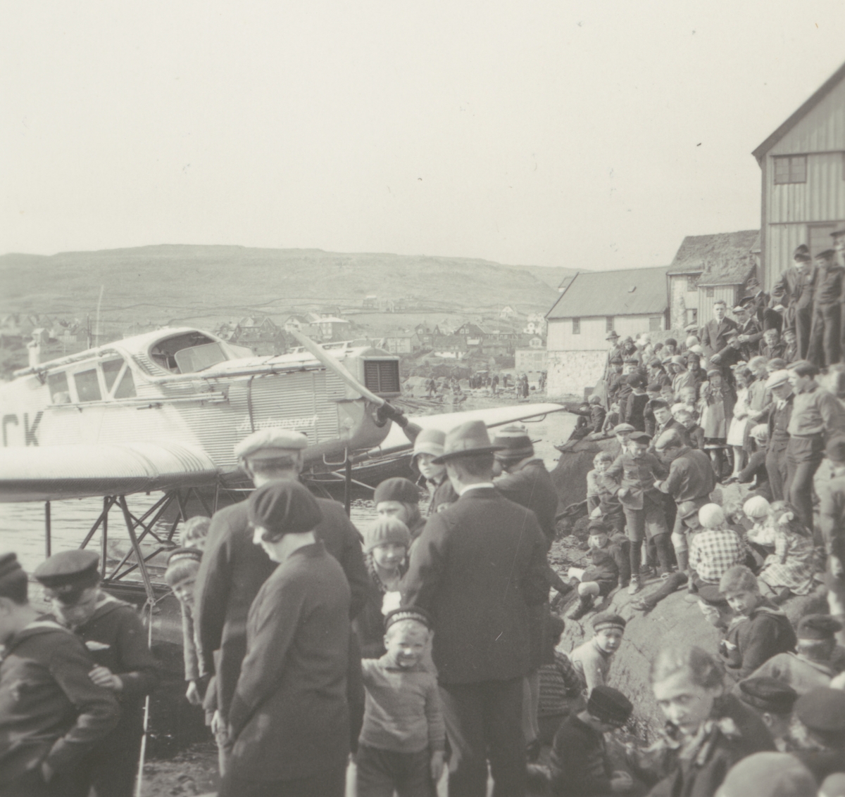 Fotografi från Albin Ahrenbergs resa till Grönland 1929. Motiv av en stor samling människor vid flygbåt i stad.