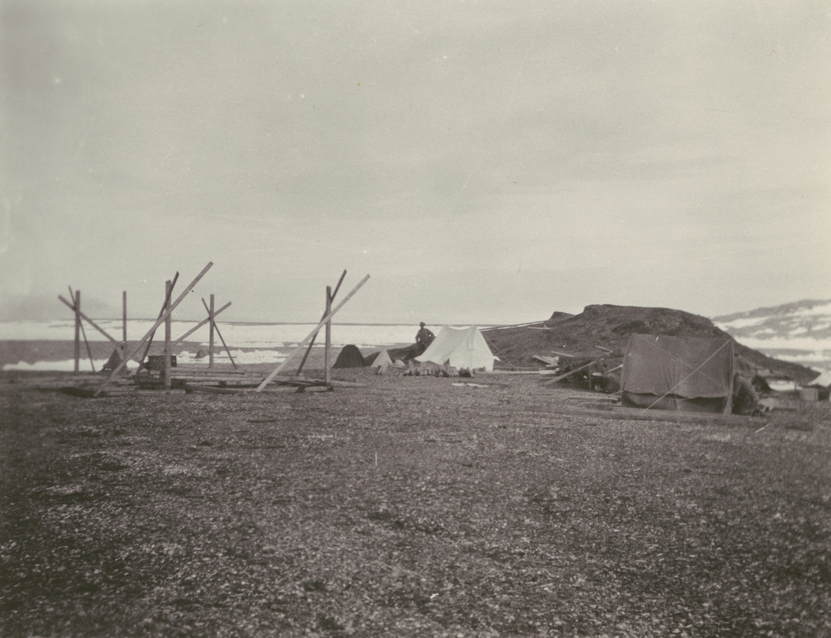Fotografi från Ahlmannexpeditionen 1931. Motiv av byggnationen av basstationen "Sveanor".