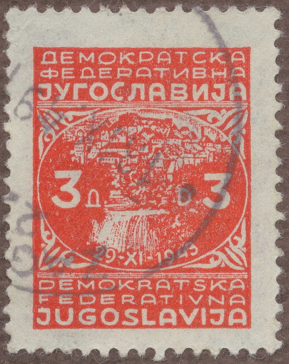 Frimärke ur Gösta Bodmans filatelistiska motivsamling, påbörjad 1950. Frimärke från Jugoslavien, 1945. Motiv av Vattenfall vid staden Jaice i Jugoslavien.