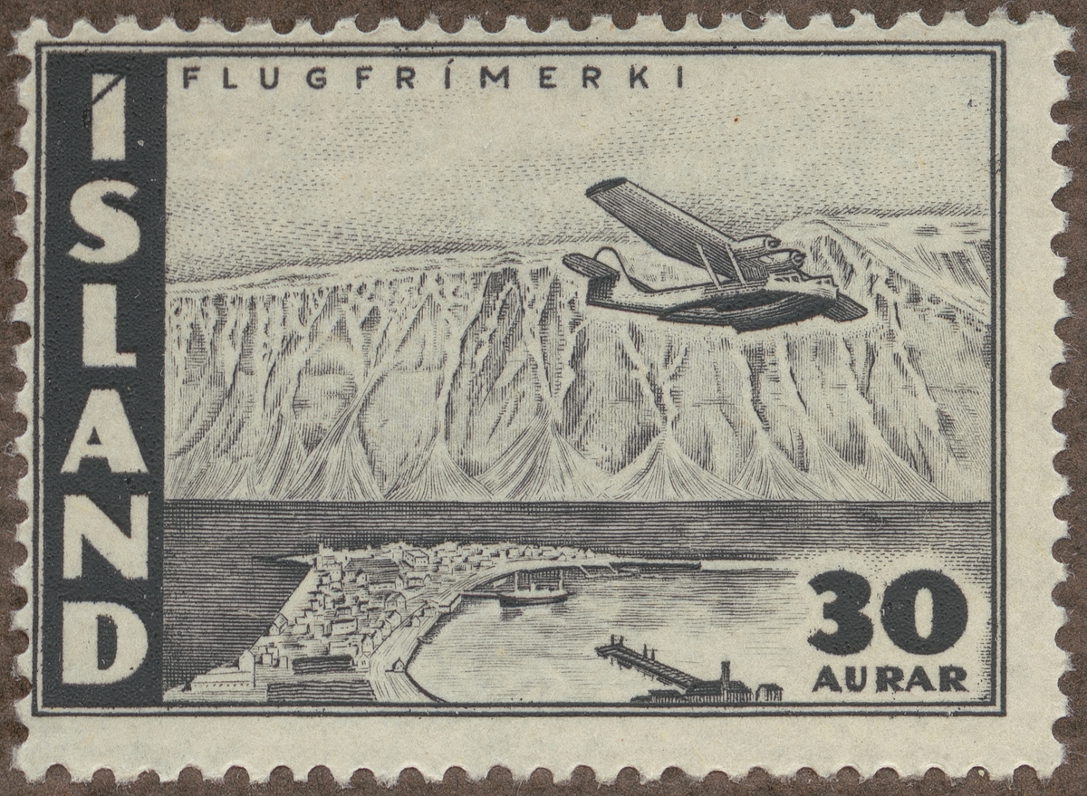 Frimärke från Island, 1947. Motiv av Flygmaskin, monoplan över Isafjördur stad: -udde med hamn och bebyggelse-