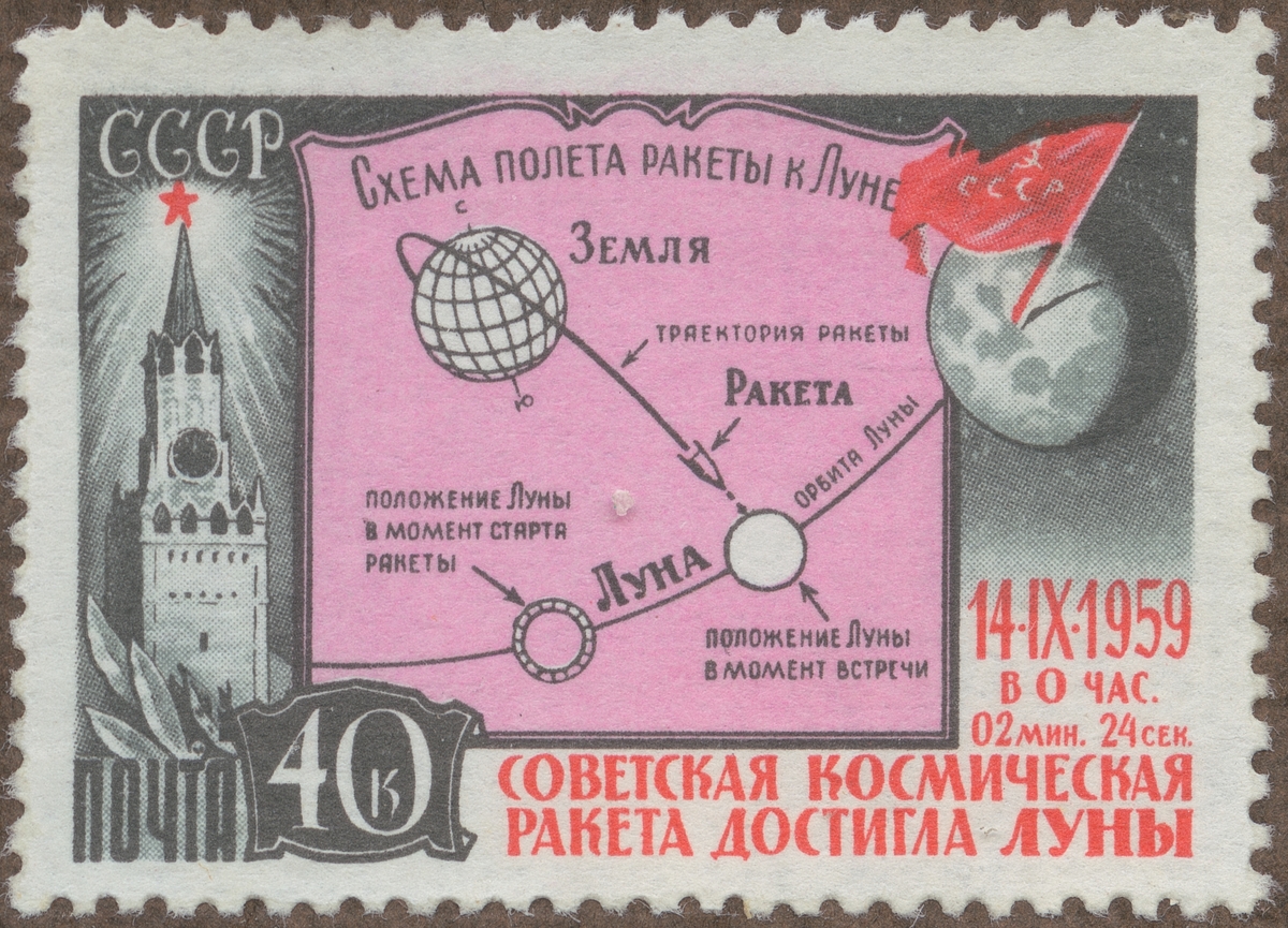 Frimärke från Ryssland, 1959. Motiv av Ryska månraketen 14 september 1959: " Nådde månen 14 september 1959, kl. 0.1 2 min. 24 sek. Jorden överst. Vänster: månpositionen vid avskjutandet. Helvit: Månens position vid mötet. Raketen: Jorden med Ryssland."